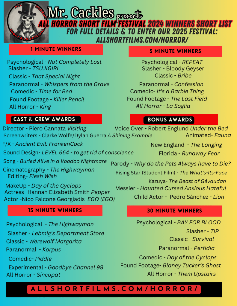 8/31/2024: 2024 ALL HORROR SHORT FILM FESTIVAL AWARD WINNERS ANNOUNCED!